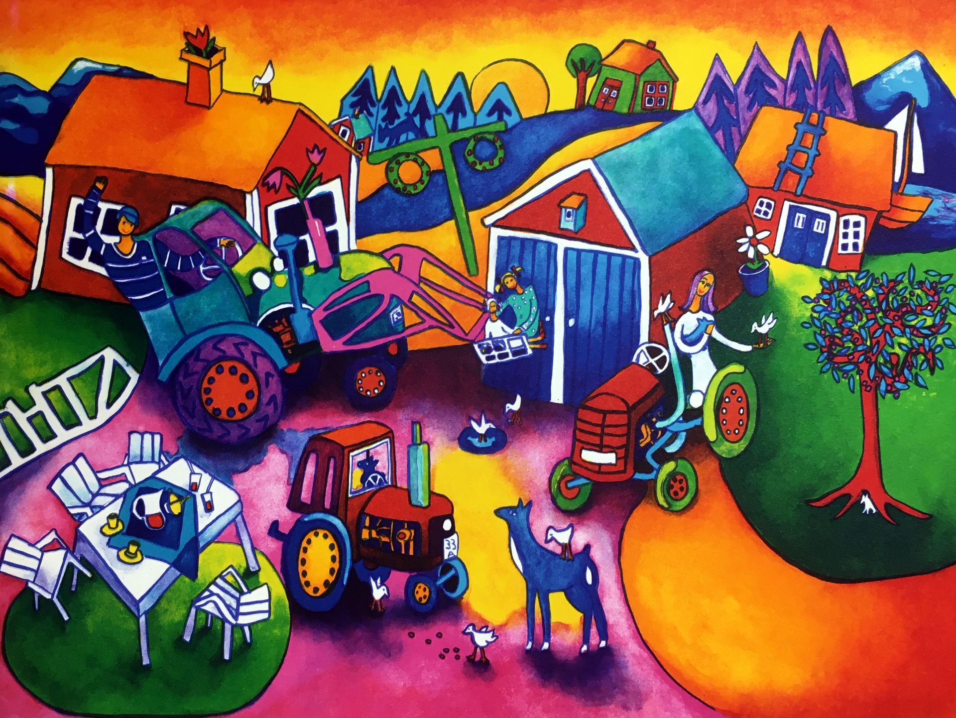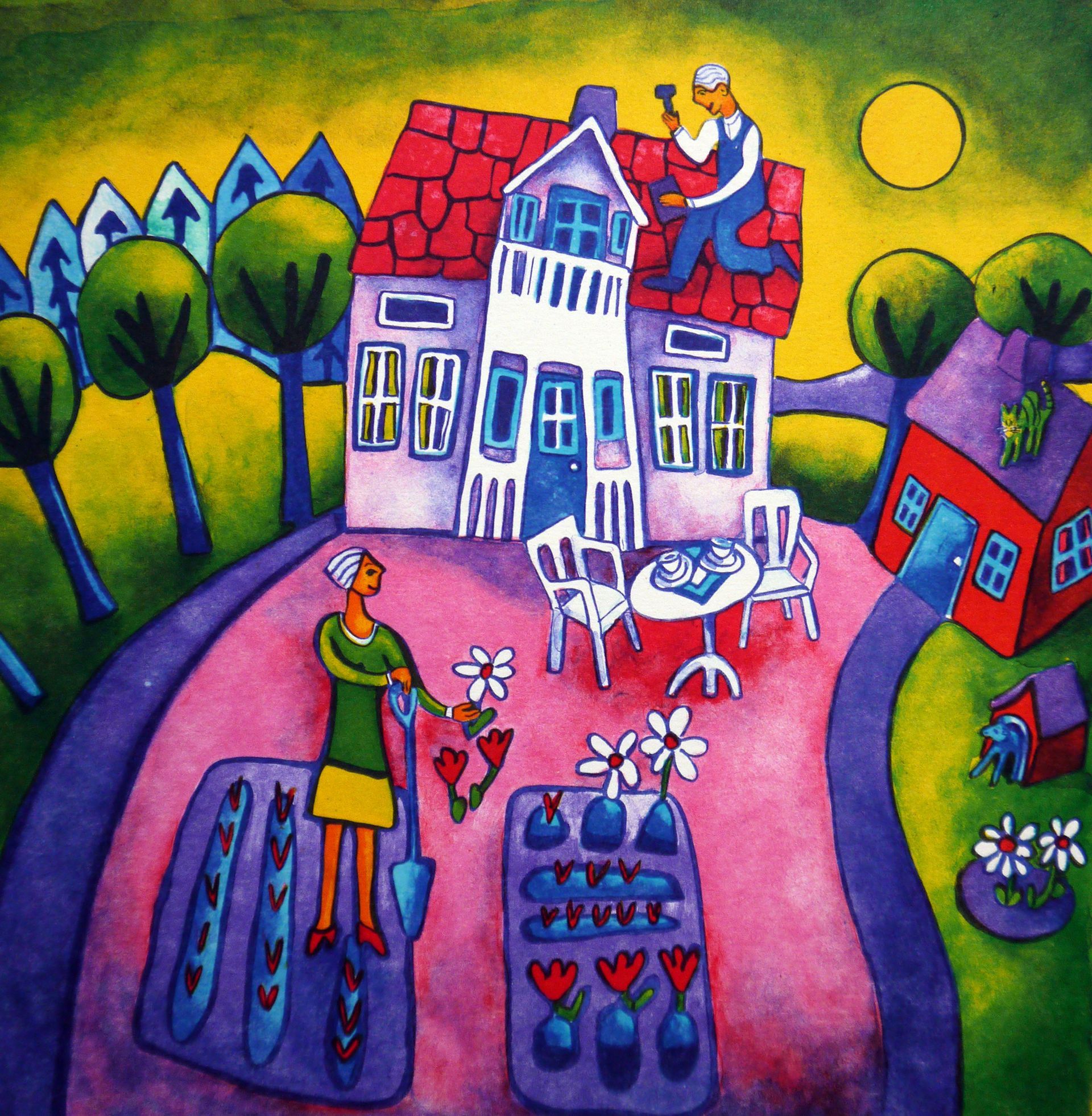 Färg är inte det enda fokus i Ingrids arbete. Hennes motiv är bland annat flytande människor, tulpaner, lutande byggnader, solar och månar. Hon skildrar tvätten, badkaret, soffborden, glada vardagsscener. Med hundar, fåglar och massor av tulpaner. Bilder skapade av en till synes raffinerad naivist som ger betraktaren en rejäl endorfinkick.